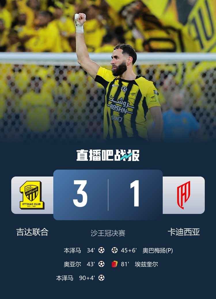 沙王冠决赛,本泽马梅开二度,吉达联合3-1卡迪西亚。